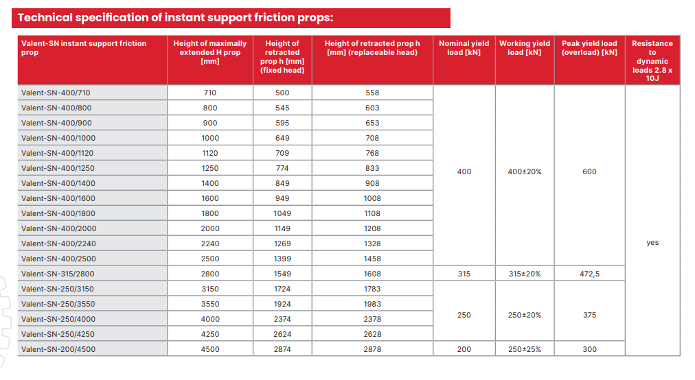 The range of VALENT-SN instant support friction props includes eighteen props characterised by a different maximum and minimum height and having different values of minimum working peak yield load.