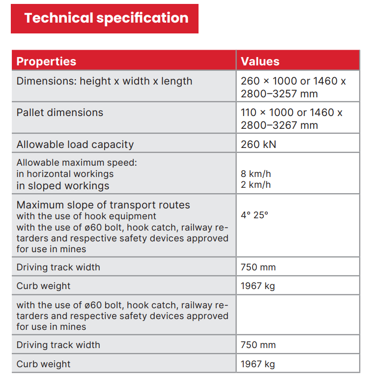 With MP-26 Platform you can run the transport of machines with up to 26 tons on the surface and underground in mines. Adequate overall dimensions of hoist shafts and adequate load capacity of shaft fittings adjusted to low platforms allows their vertical transport through the shaft. Application of rotationally seated RBK5 handles enable the use of transport tie-rods to stabilise the load. Type RZKR tie-rods are recommended. The platform can be used as a pallet to carry the loads transported on it by a suspension railway. On the surface, the platform can be moved by means of hoisting cranes, forklift trucks and other transport means (e.g. cars).