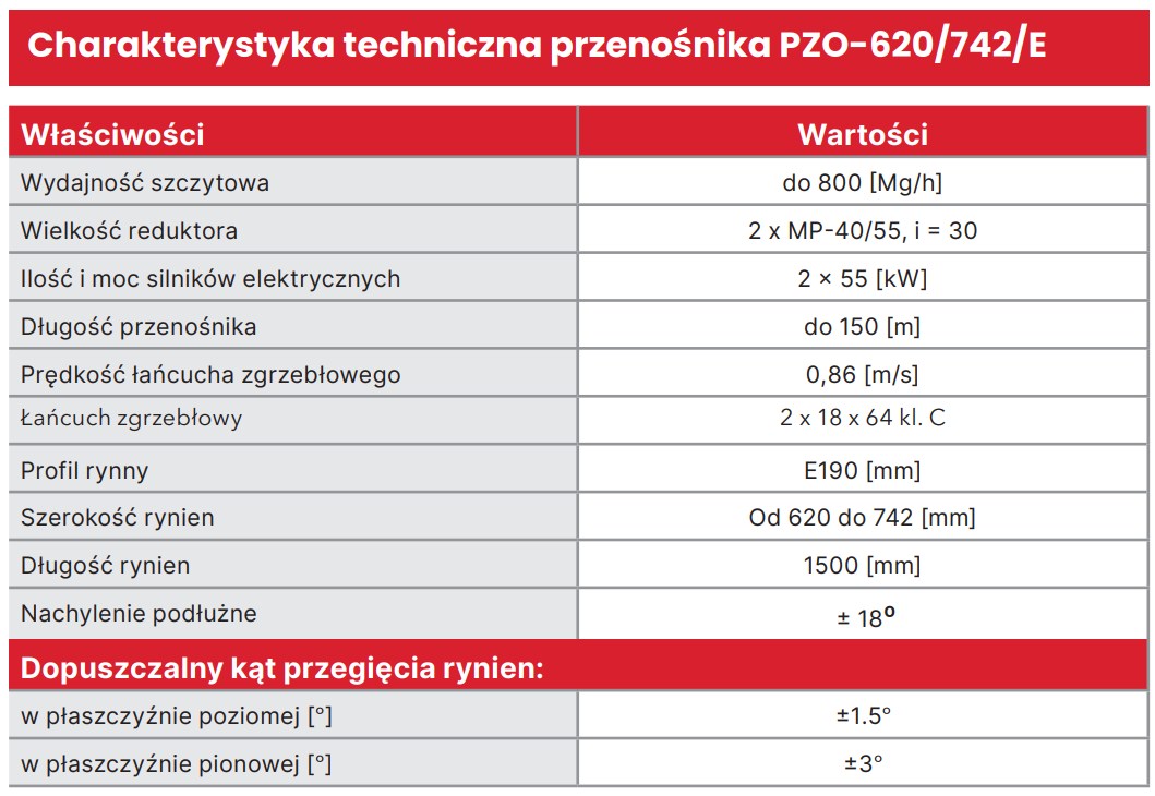 Przenośnik zgrzebłowy odstawczy PZO620/742/E jest przeznaczony do odstawy urobku z chodników wyrobisk kamiennych i kamiennowęglowych poziomych lub nachylonych podłużnie do ± 18 º i poprzecznie min. ± 8 º. Może być eksploatowany w podziemnych wyrobiskach zakładów górniczych w pomieszczeniach ze stopniem „a”, „b”,” c” niebezpieczeństwa wybuchu metanu i klasy A i B zagrożenia wybuchem pyłu węglowego.